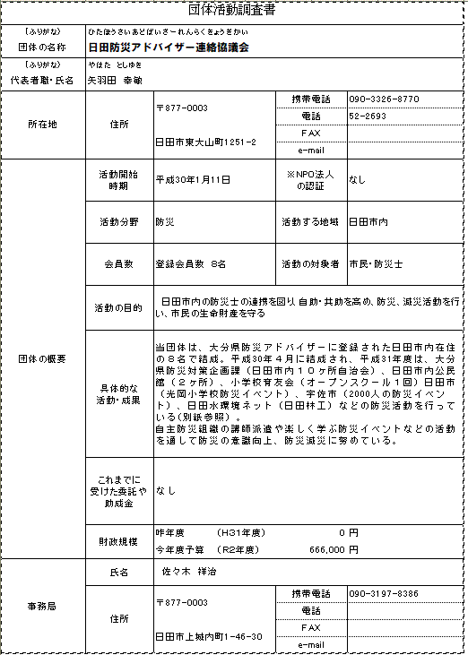 3月 全体の事業計画 4月 案内文の発送 講演会関係者への送付と告知(自治会長会など) 公民館事業団との協議 5月 日田市女性防災士連絡会の設立総会 「自主避難を迅速するため」の講演会の開催 6月 日田市女性防災士連絡会の懇談会 9月〜11月 公民館と連携し講演会やワークショップの開催を行い防災士の連携を図る。 @